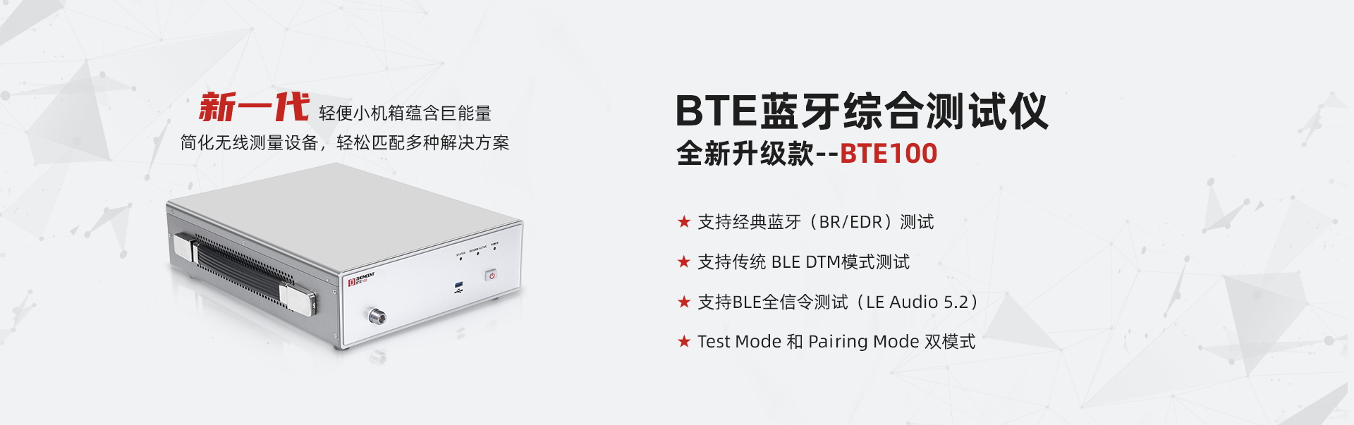 BTE100+是由中承科技獨立自主研發(fā)的新一代藍牙射頻協(xié)議綜測儀,支持藍牙設(shè)備配對信令模式下的功率、頻偏、調(diào)制、接收靈敏度、吞吐量等射頻指標(biāo)精準(zhǔn)測試,支持多種藍牙協(xié)議版本的深度解析及實時IQ數(shù)據(jù)捕獲。